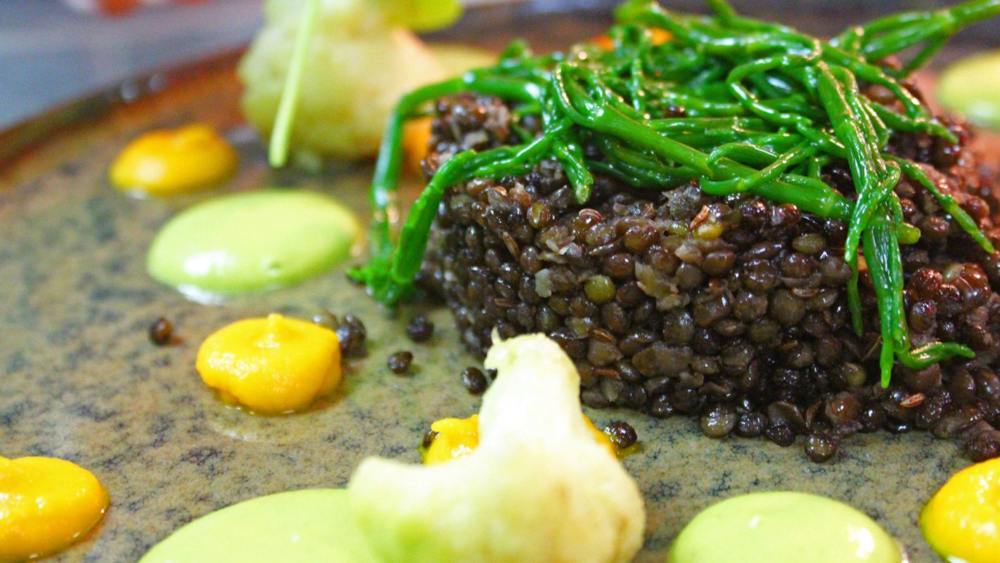 “Cerchiamo di cucinare nel modo più leggero e più puro possibile”, afferma lo chef, e poi mescola, verifica per l’ultima volta che il sapore sia quello desiderato e guarnisce la colorata composizione di insalata con un gesto sicuro.